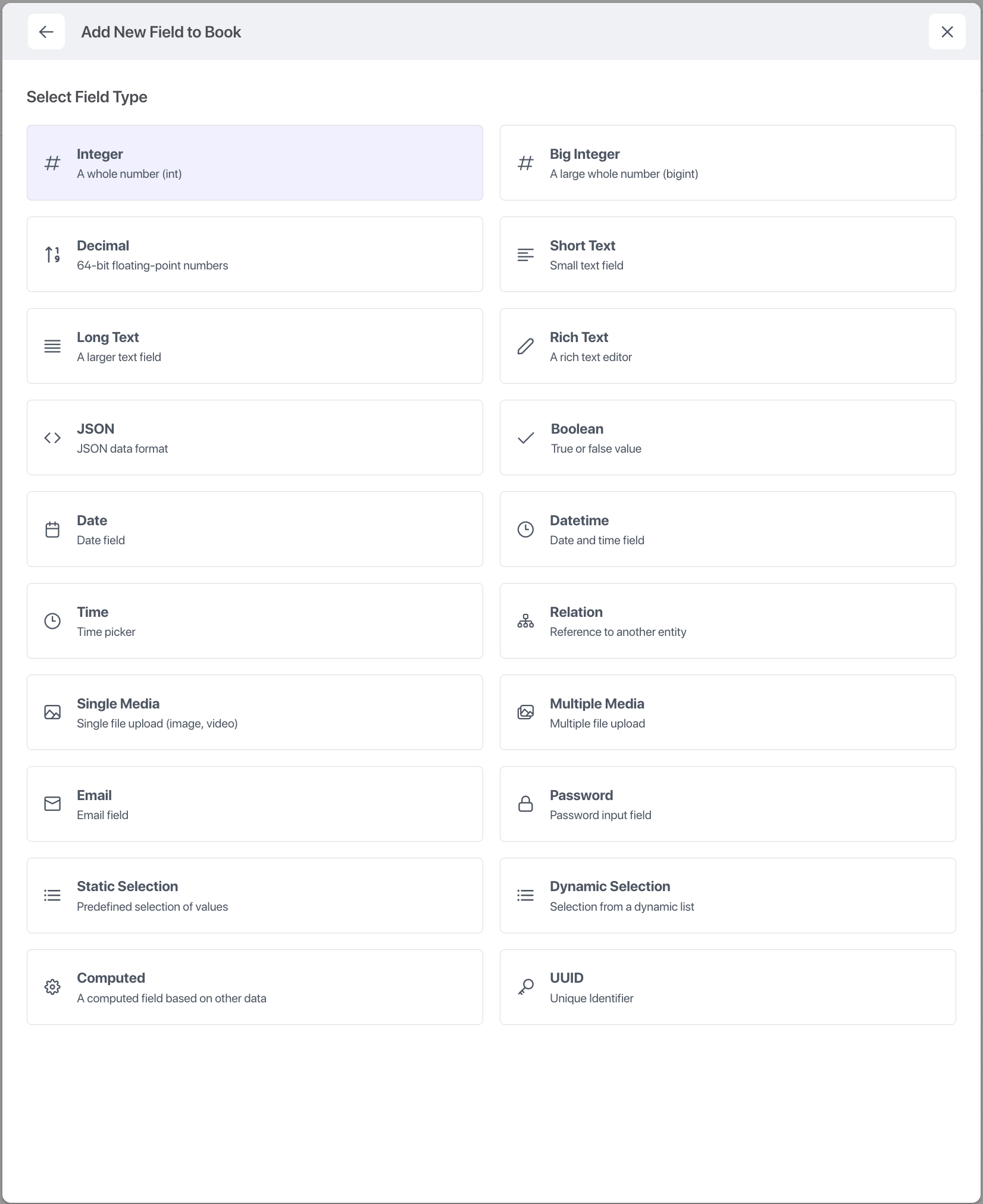 This will open up the "Add New Field" popup. Adding a field involves first selecting the type of field you want to add, and then providing field specific metadata.