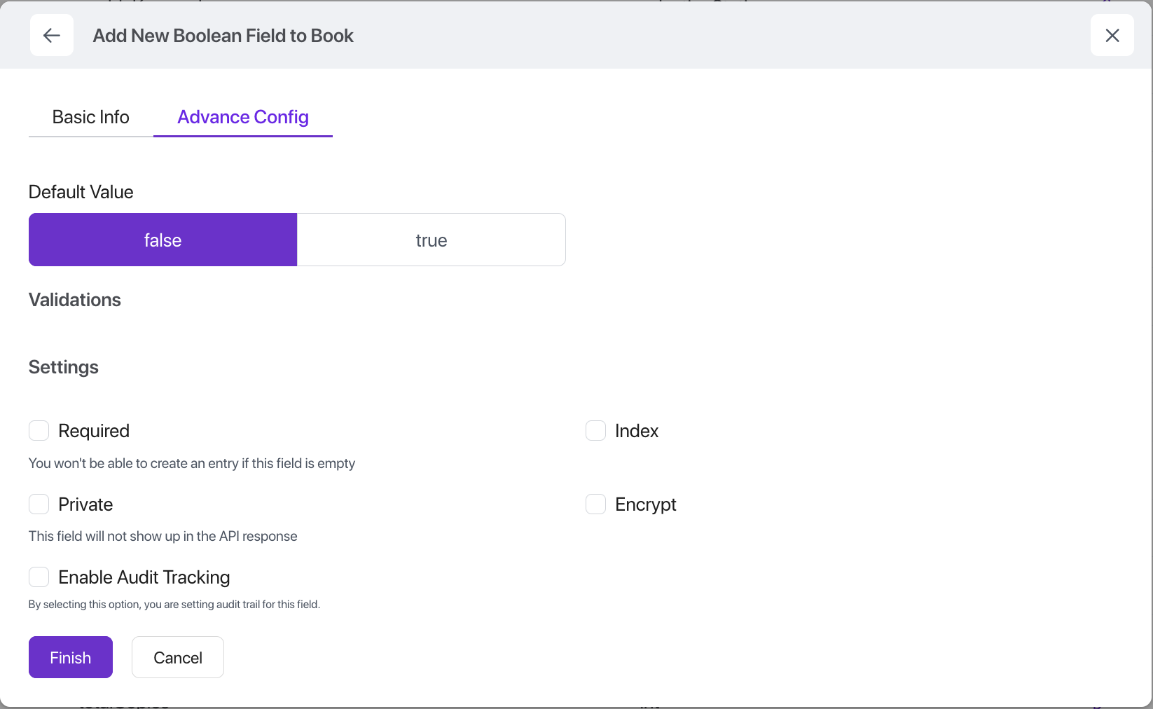 Boolean fields store true or false values, commonly used for toggles, flags, or status indicators within your data model.