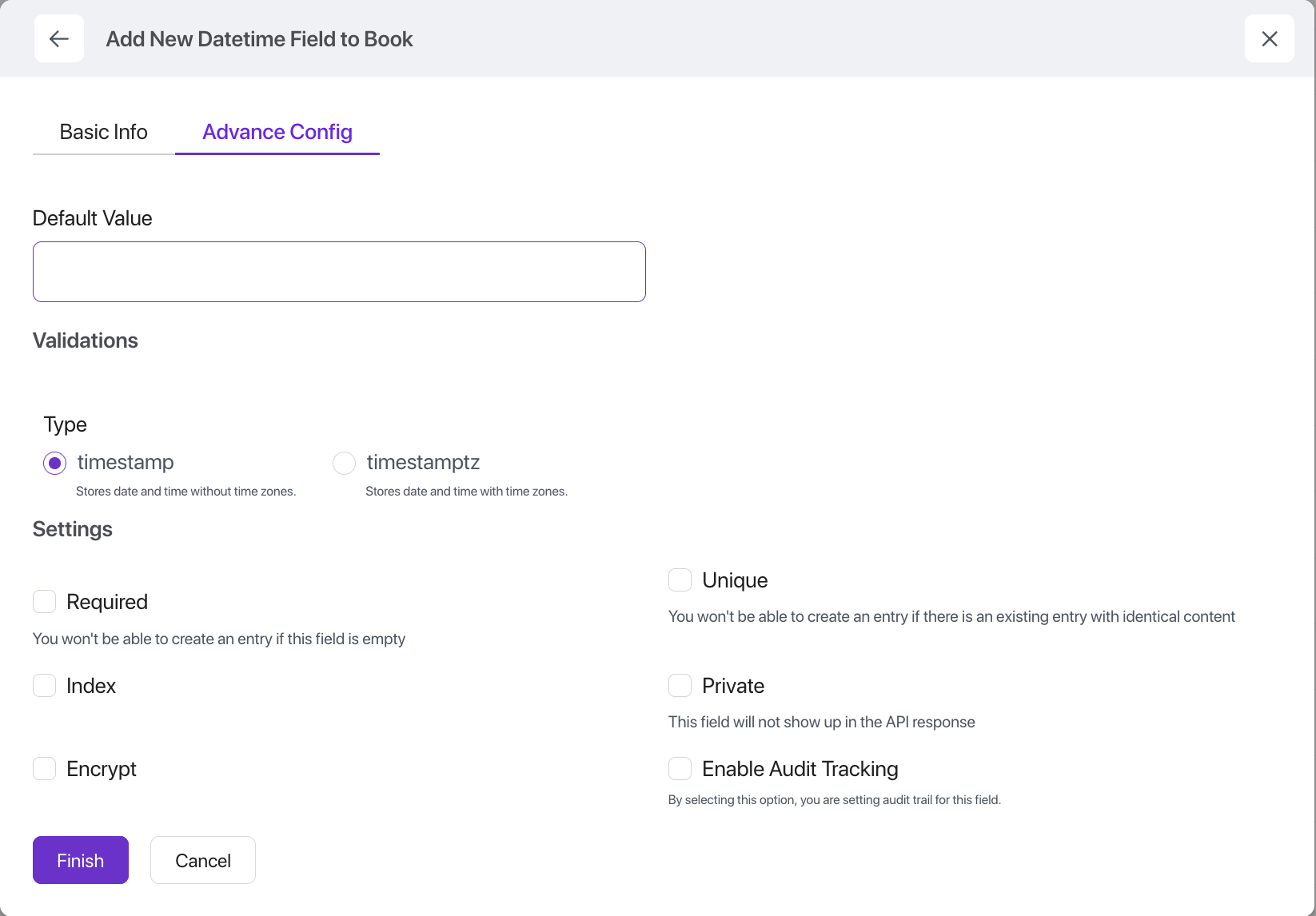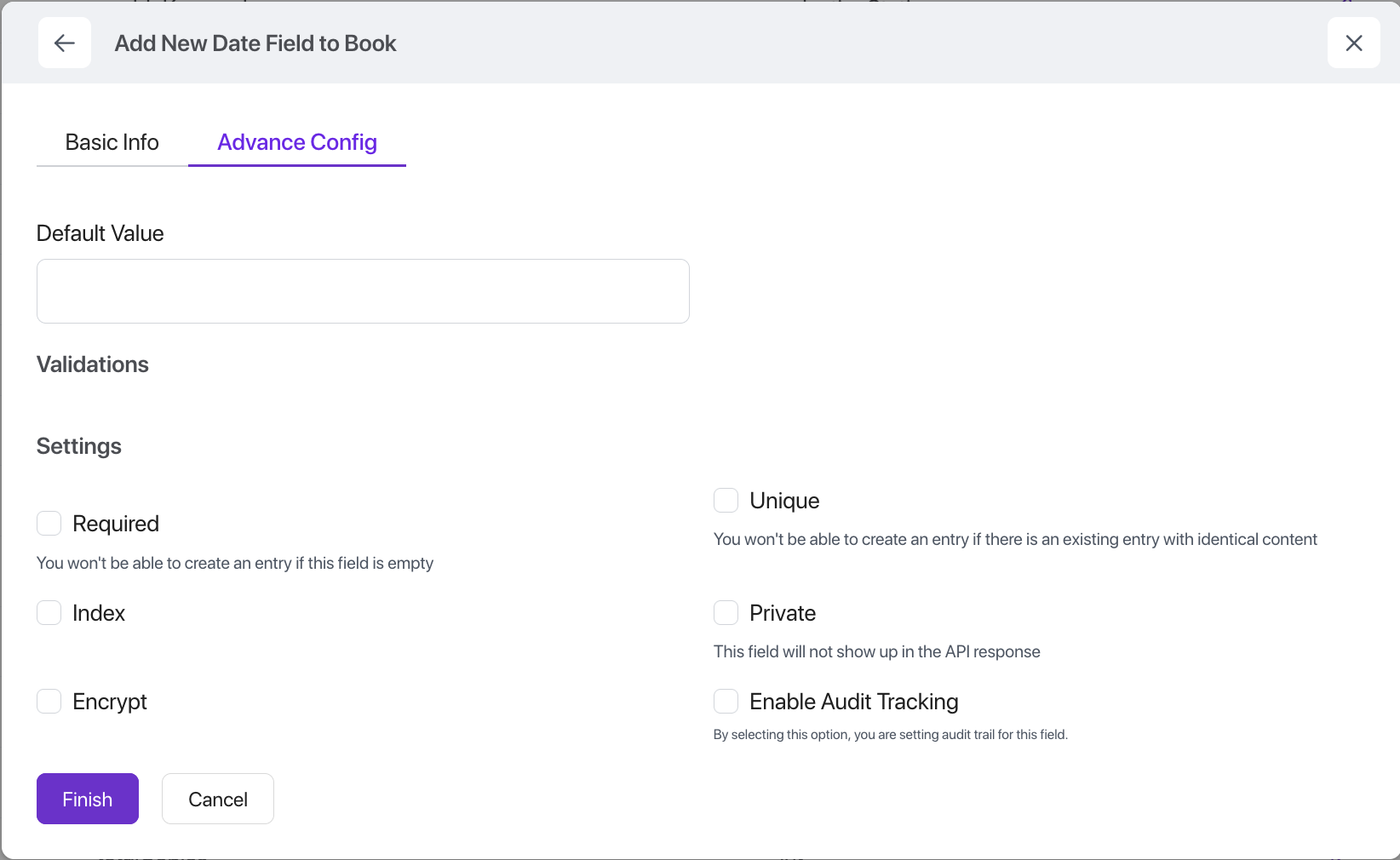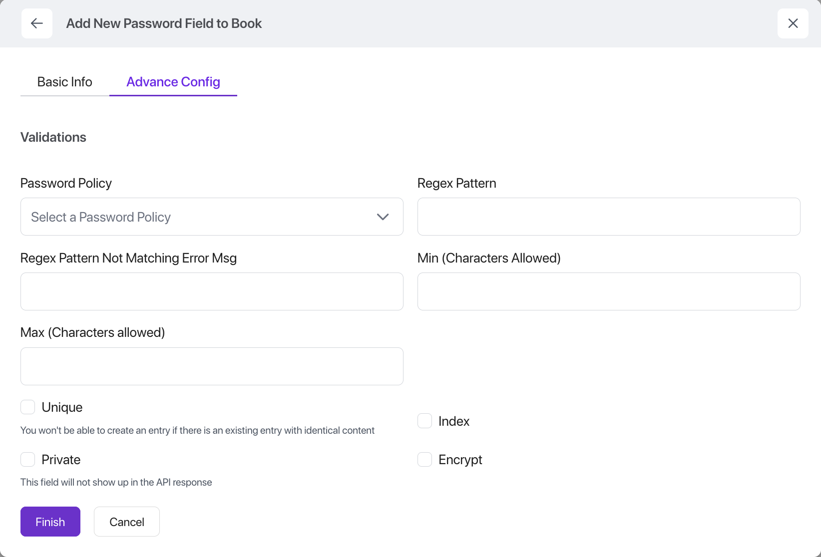 - Private: Excludes the field from API read responses to protect sensitive data.