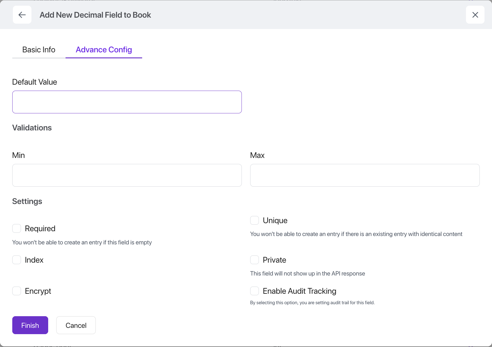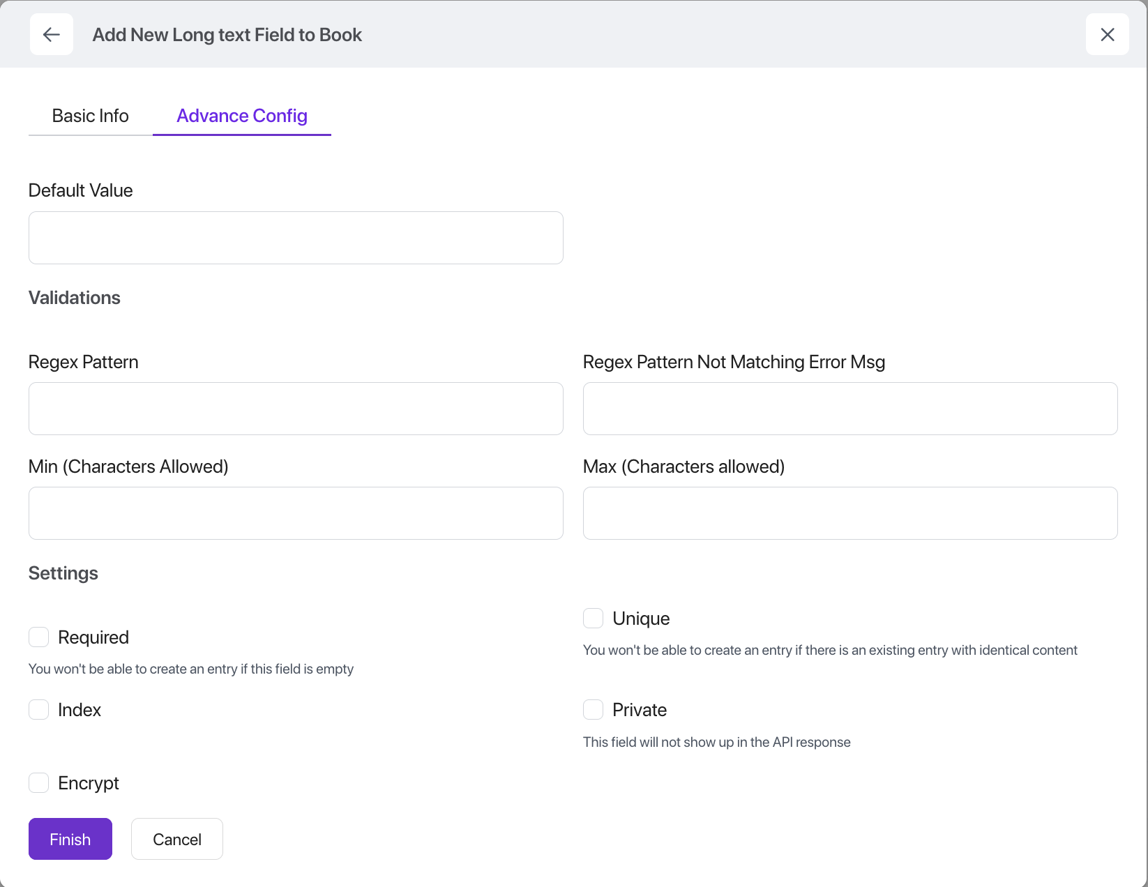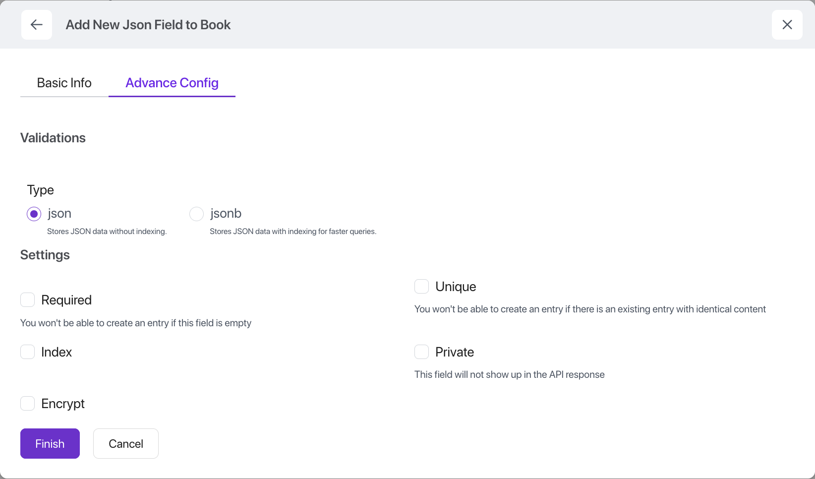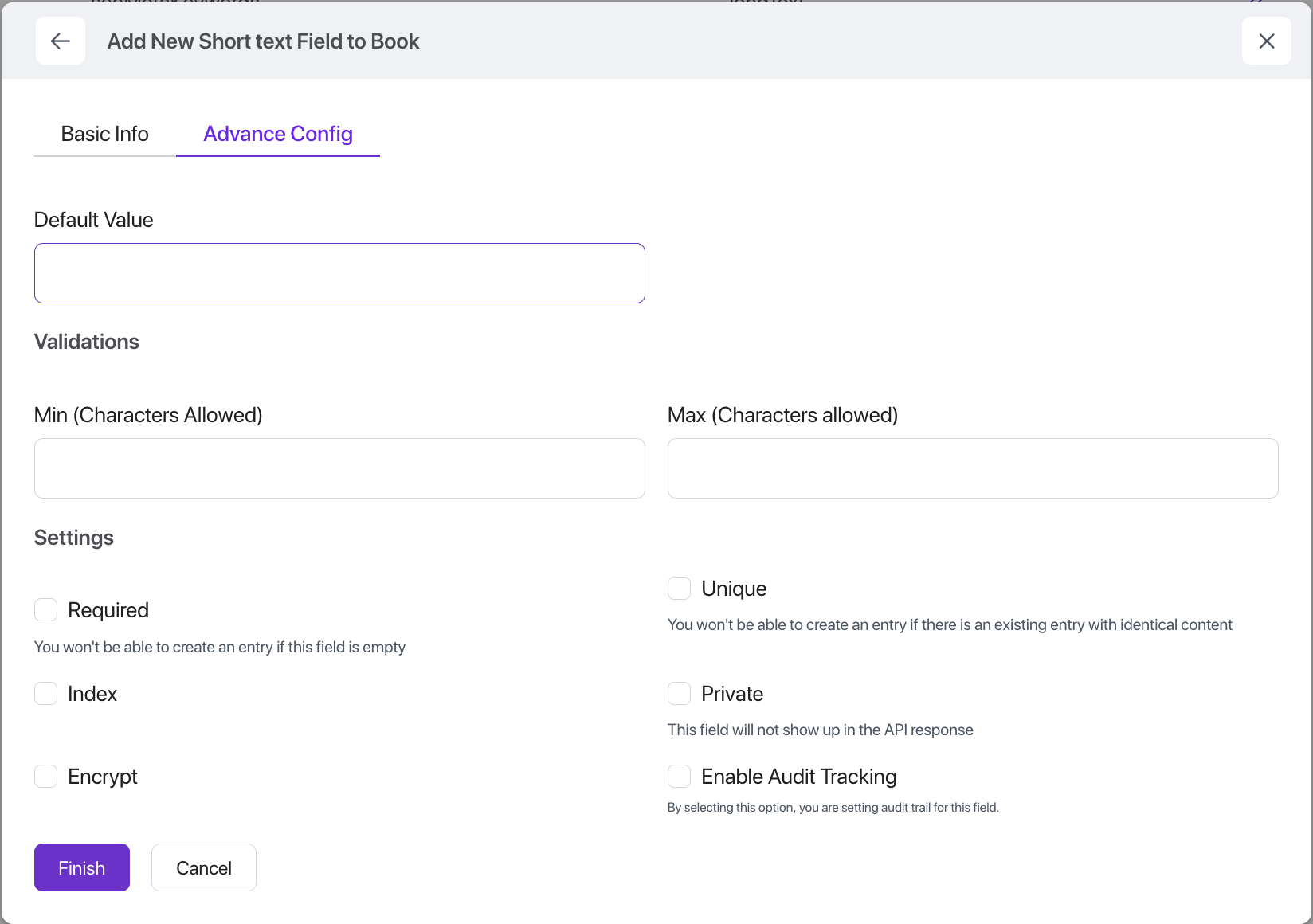 The metadata you provide is itself split into 2 parts Basic & Advanced. Basic metadata is common for all fields, while the Advanced metadata varies based on the field type.