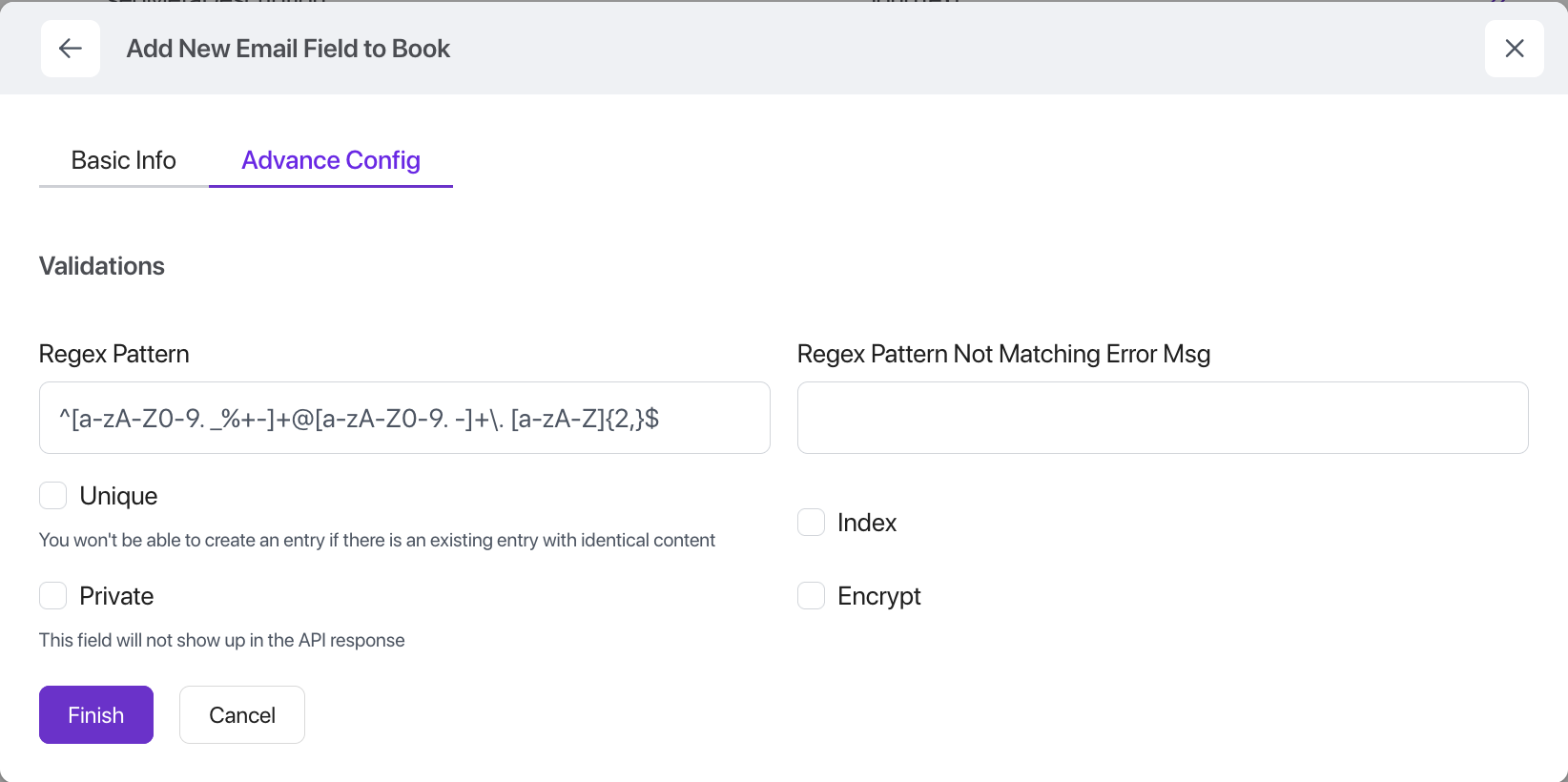 - Regex not matching error: The error message to display if a fields value does not confirm to the Regex provided.