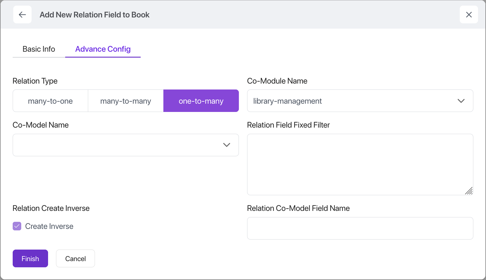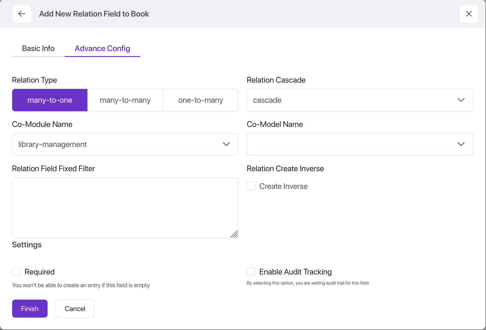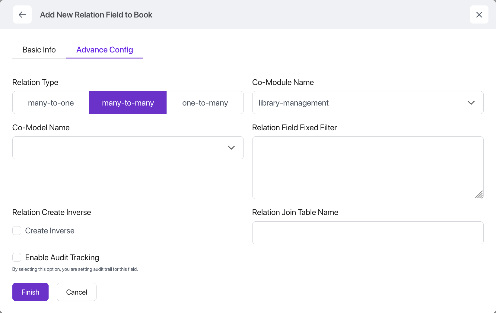 Example: If a Student model exists in the Academics module and a Course model in the Learning module, you can create a many-to-many relation between them. - Co-Model Name
