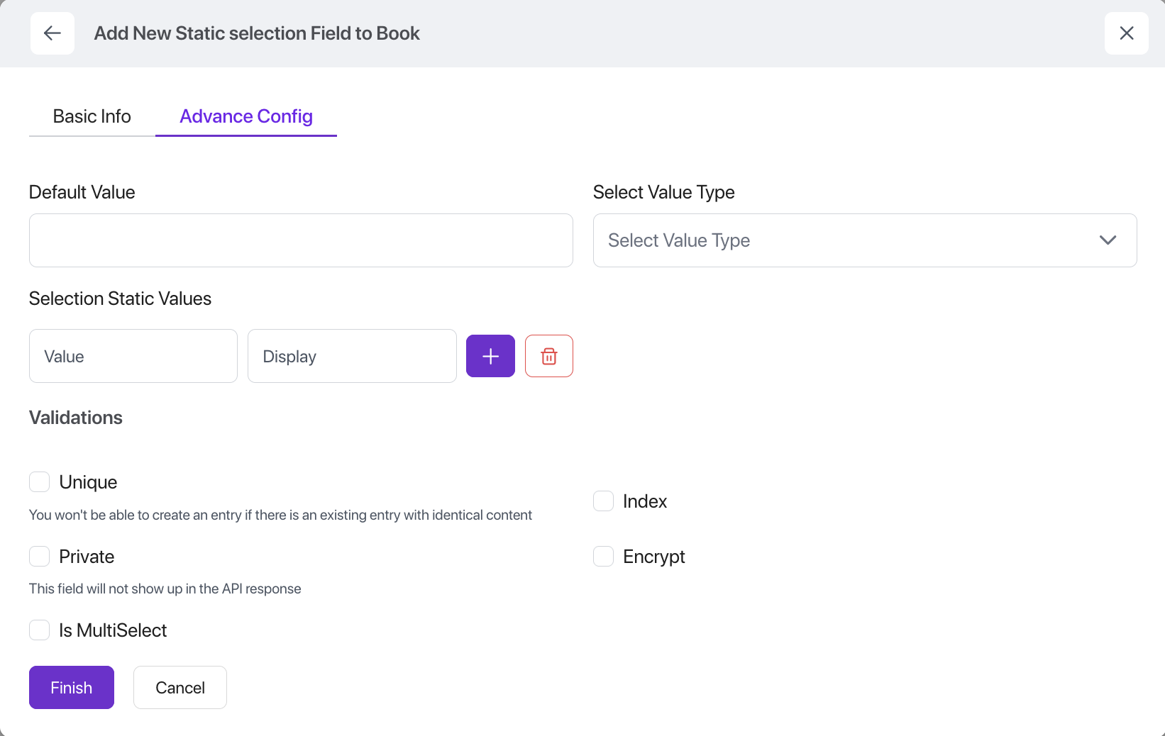The SelectionStatic field in SolidX allows users to choose a value from a predefined, fixed list of options. It’s ideal for dropdowns, radio buttons, or selection lists where the choices are known and unchanging.
