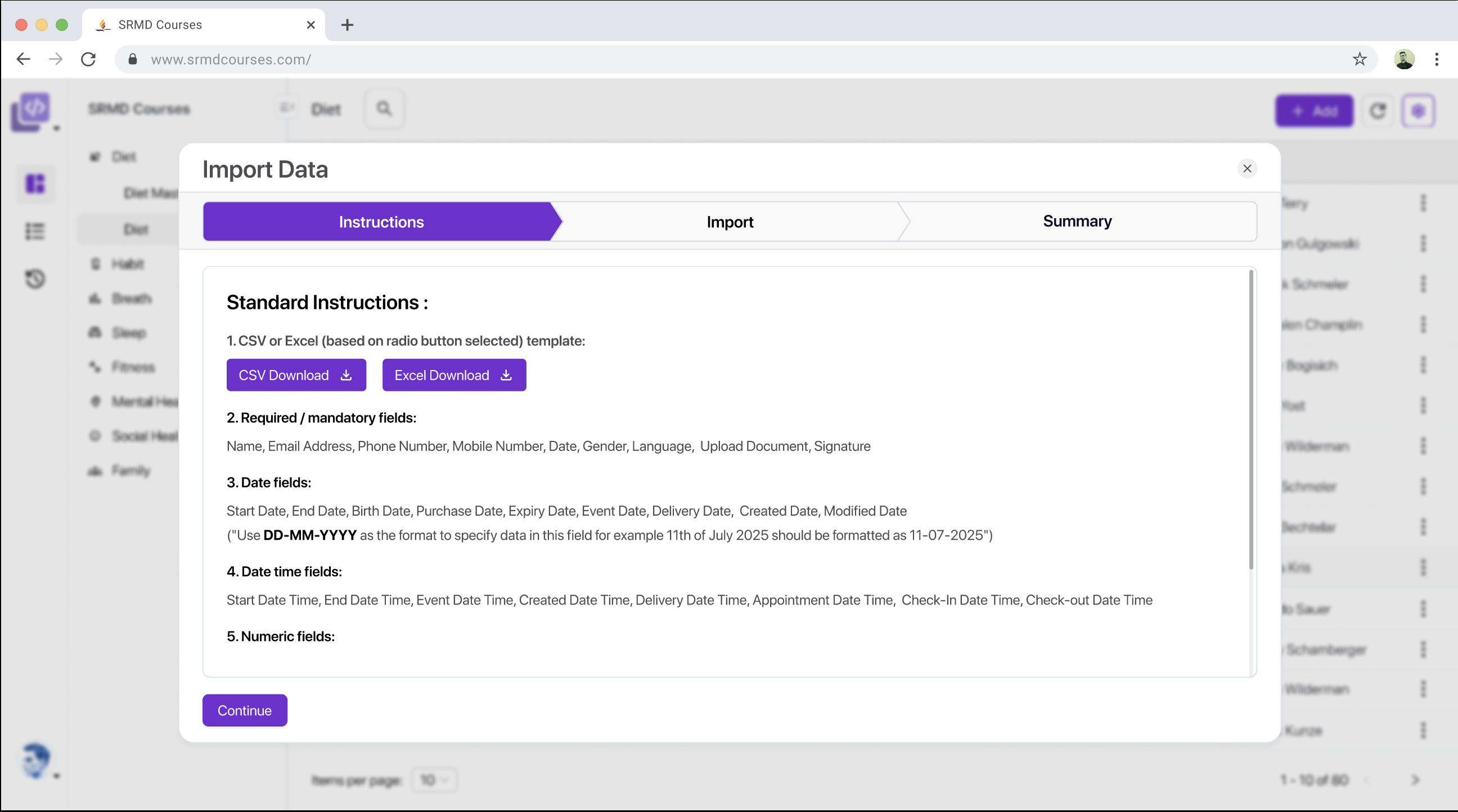 As the first step of the import process SolidX provides a pre-built excel template that can be used to import the data. This template is automatically generated based on the model & field metadata. This screen also displays other instructions around validations etc that will be applied when the excel is imported.