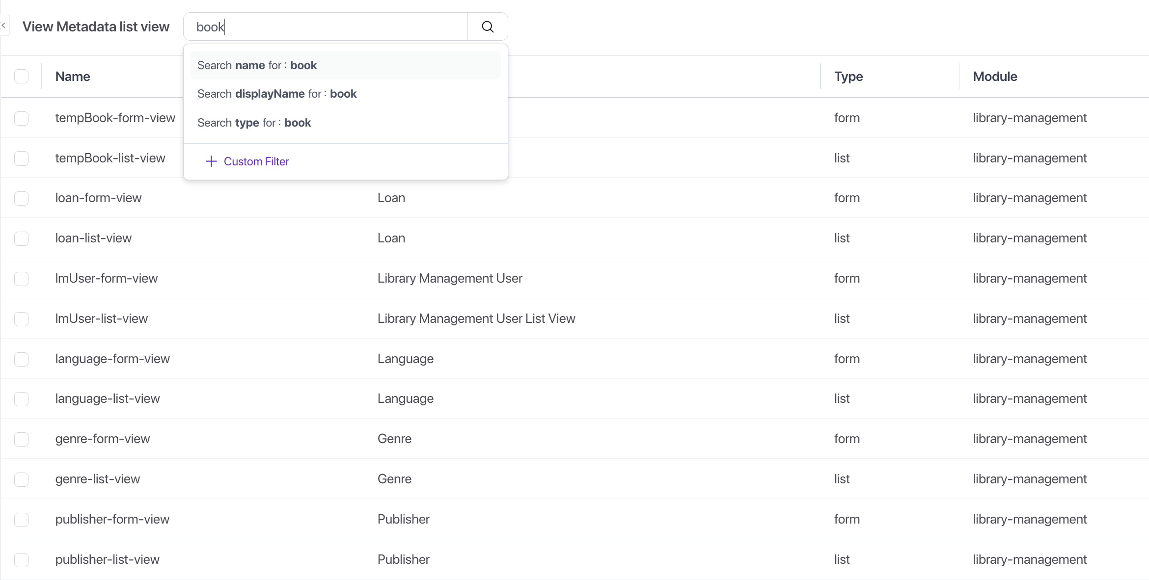 Enabled via enableGlobalSearch: true, this allows users to search across multiple searchable fields quickly. Fields marked with isSearchable: true participate in this feature.