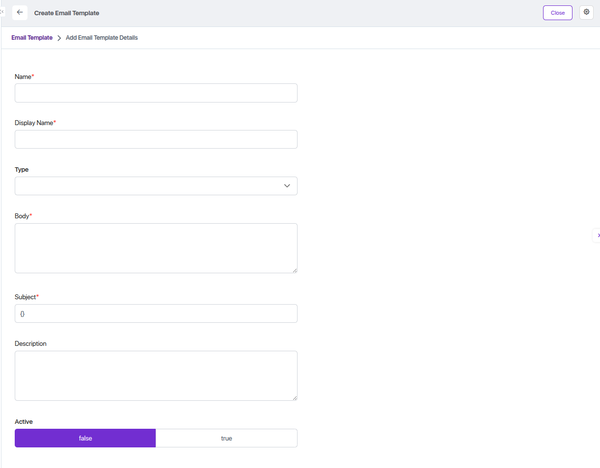 | description | Optional description for the email template | Explains purpose or usage; optional |